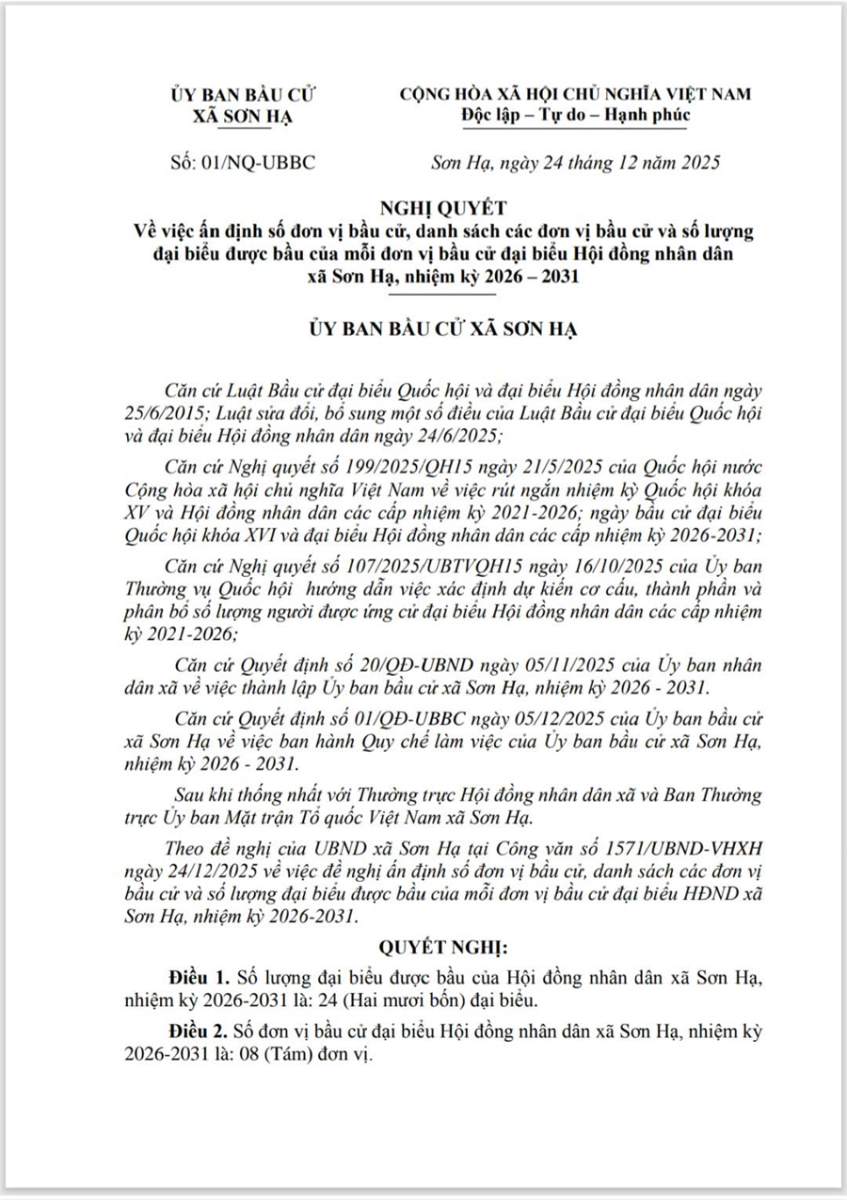 Ủy ban bầu cử xã Sơn Hạ vừa ban hành Nghị quyết số 01/NQ-UBBC ngày 24/12/2025 về việc ấn định số đơn vị bầu cử, danh sách các đơn vị bầu cử và số lượng đại biểu được bầu của mỗi đơn vị bầu cử đại biểu Hội đồng nhân dân xã Sơn Hạ, nhiệm kỳ 2026 – 2031.