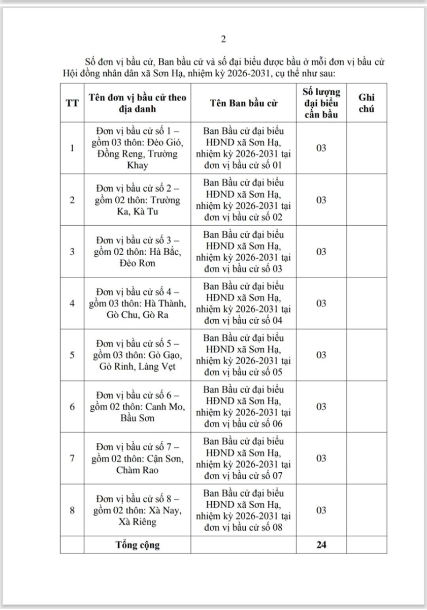 Theo đó, Số lượng đại biểu được bầu của Hội đồng nhân dân xã Sơn Hạ, nhiệm kỳ 2026-2031 là 24 đại biểu. Số đơn vị bầu cử đại biểu Hội đồng nhân dân xã Sơn Hạ, nhiệm kỳ 2026-2031 là 08 đơn vị.