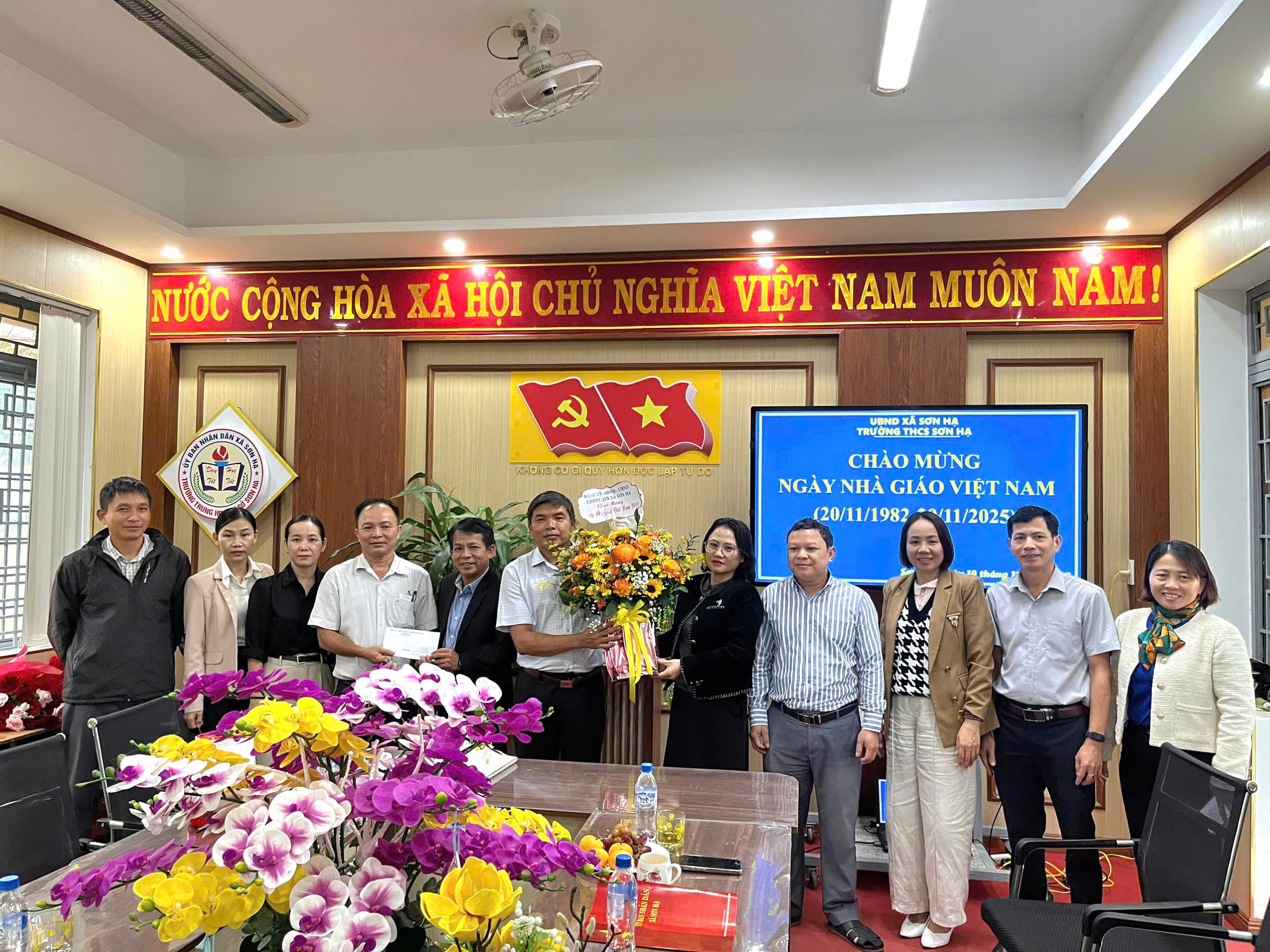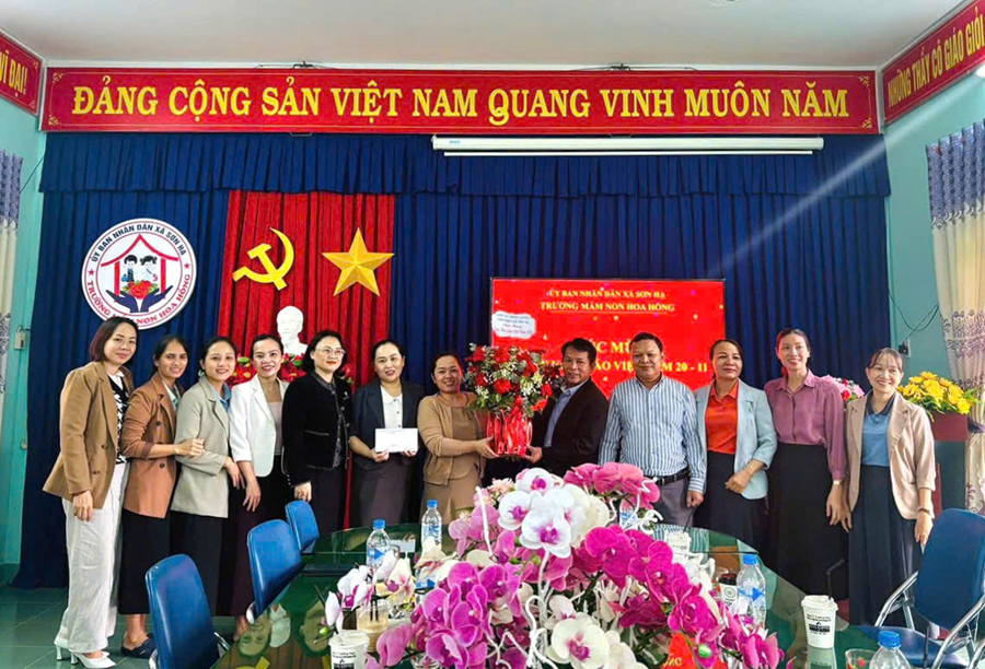 Tại các trường, thay mặt Đảng ủy, HĐND, UBND, UBMTTQ Việt Nam xã Sơn Hạ, đồng chí Chủ tịch UBND xã Võ Thị Xuân Liễu đã trao tặng lẵng hoa và gửi lời chúc mừng tốt đẹp nhất tới tập thể cán bộ, giáo viên, nhân viên; đồng thời ghi nhận sự cố gắng, tâm huyết của đội ngũ nhà giáo trong việc nâng cao chất lượng giáo dục trên địa bàn xã.