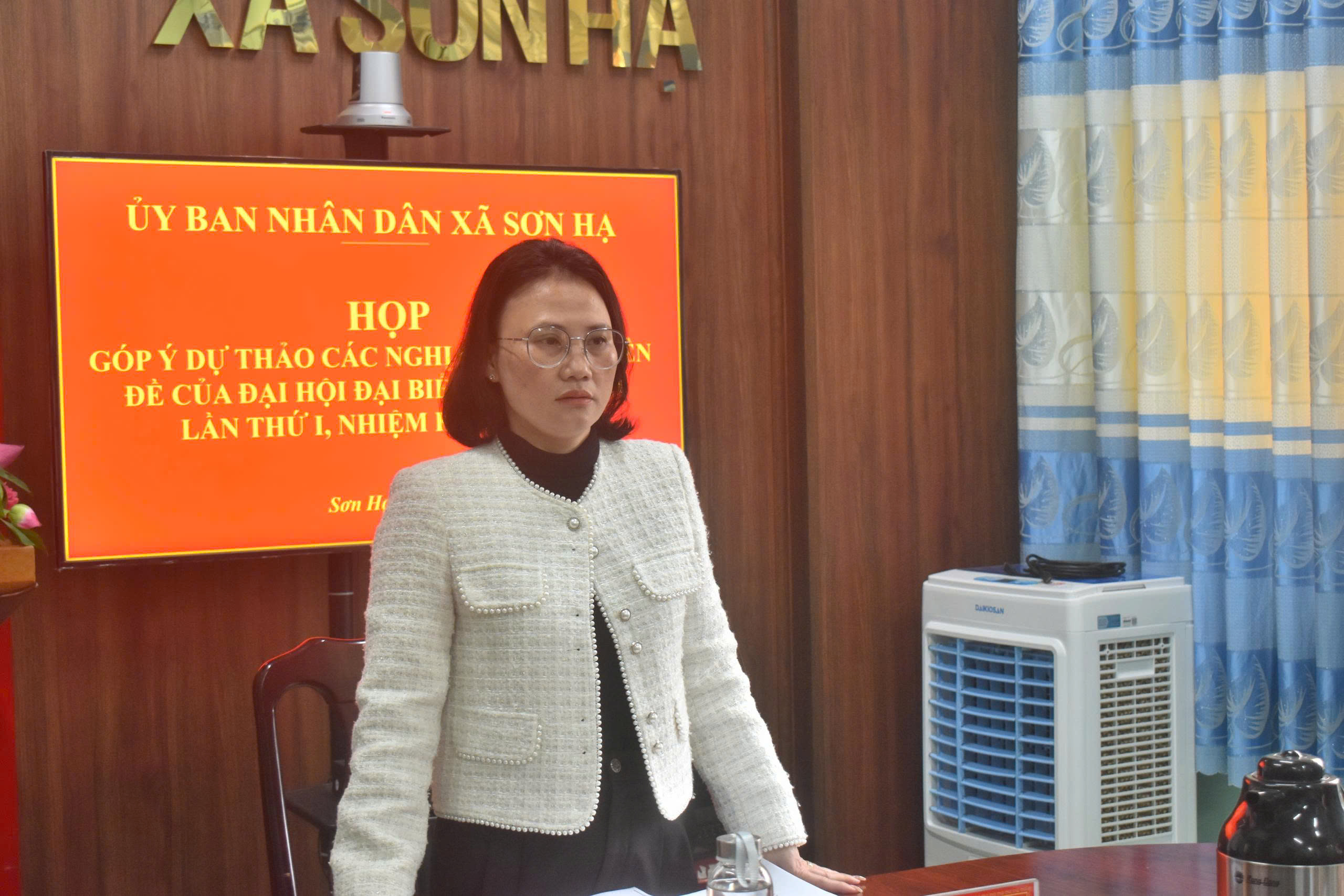 Tại cuộc họp, các Phòng chuyên môn đã thông qua dự thảo các Nghị quyết về tập trung đẩy mạnh phát triển khoa học, công nghệ, đổi mới sáng tạo và chuyển đổi số toàn diện trên cả 3 trụ cột: Chính quyền số, kinh tế số, xã hội số nhằm nâng cao chất lượng phục vụ Nhân dân trên địa bàn xã Sơn Hạ; Nghị quyết đẩy mạnh phát triển nông, lâm nghiệp theo hướng tập trung gắn với phát triển kinh tế tập thể, hợp tác xã hiệu quả và bền vững; Nghị quyết về huy động và sử dụng hiệu quả các nguồn lực để phát triển công nghiệp trên địa bàn xã Sơn Hạ.