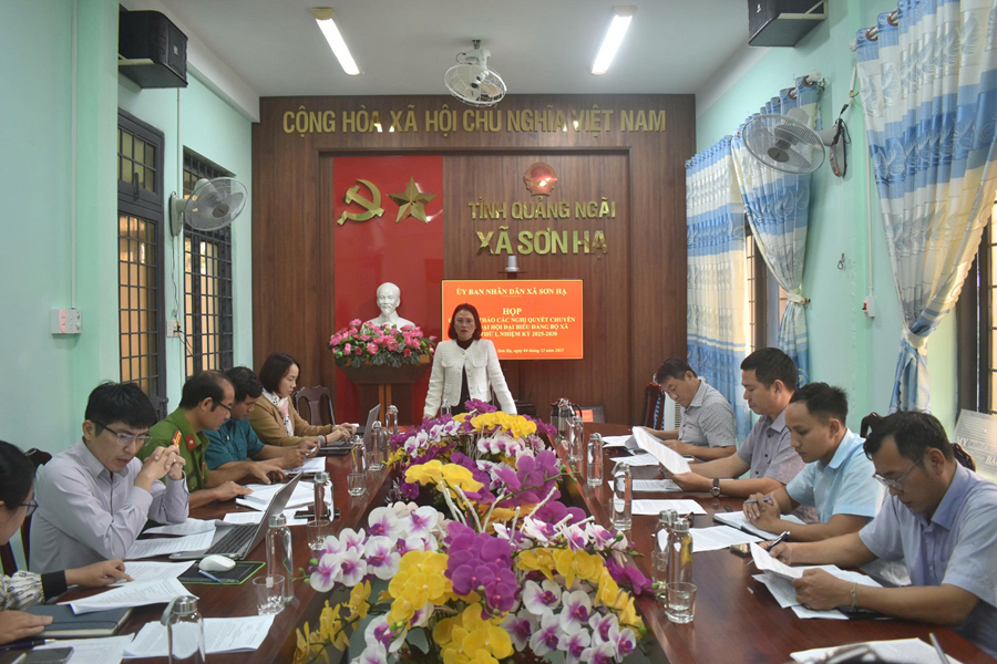 Sáng ngày 4/12, UBND xã Sơn Hạ tổ chức họp thông qua dự thảo các Nghị quyết chuyên đề Đại hội đại biểu Đảng bộ xã lần thứ I, nhiệm kỳ 2025-2030. Đồng chí Võ Thị Xuân Liễu - Chủ tịch UBND xã Chủ trì cuộc họp. Tham dự có Phó Chủ tịch Thường trực UBND xã Nguyễn Tùng Sơn; Lãnh đạo các đơn vị, phòng chuyên môn thuộc UBND xã.