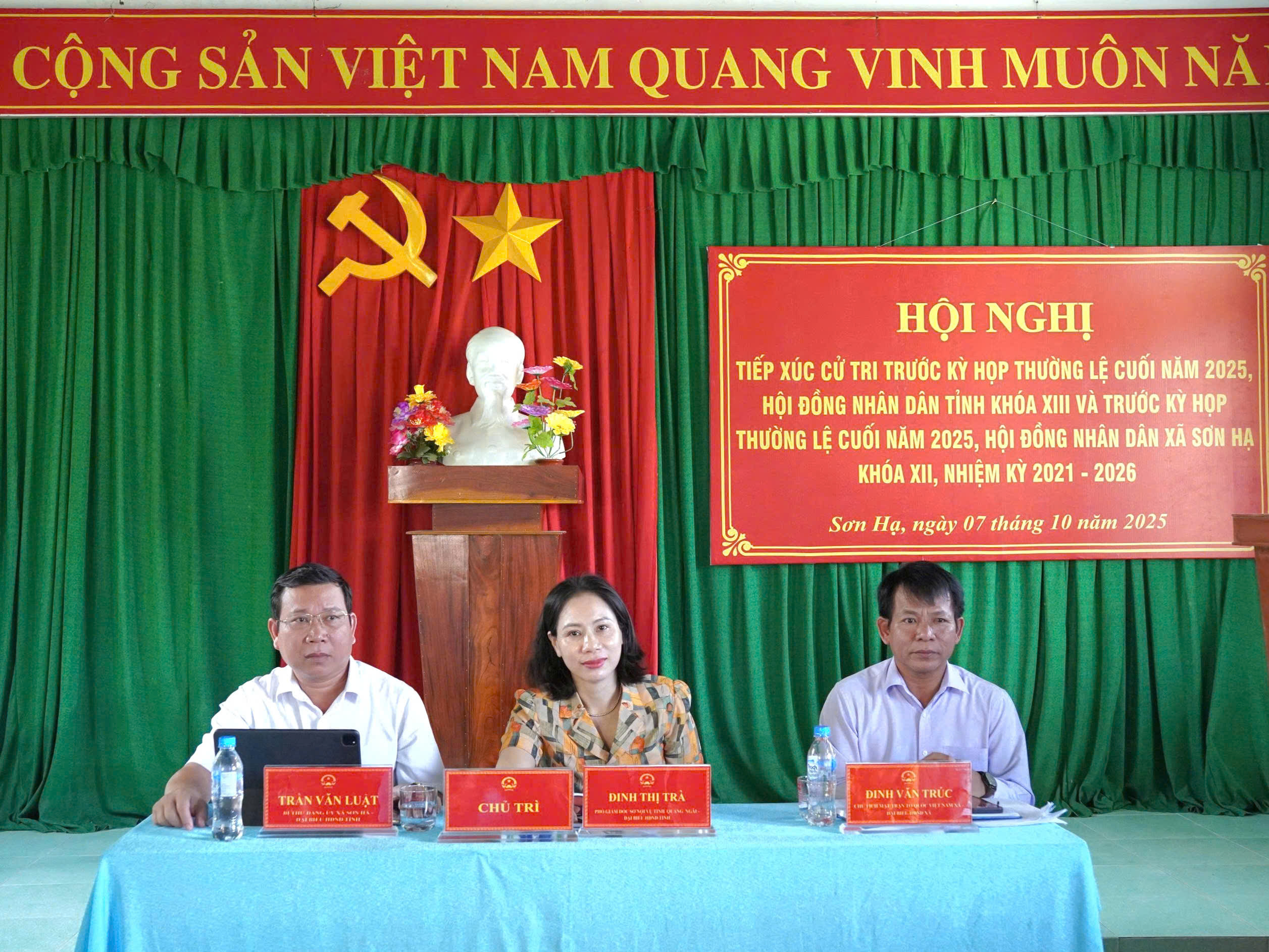 Sáng nay (7/10), Tổ đại biểu HĐND tỉnh gồm các đồng chí: Đinh Thị Trà - Phó Giám đốc Sở Nội vụ tỉnh Quảng Ngãi; Trần Văn Luật - Bí thư Đảng ủy, Chủ tịch HĐND xã Sơn Hà cùng với tổ đại biểu số 3 HĐND xã Sơn Hạ đã về tiếp xúc với bà con cử tri thôn Xà Riêng trước Kỳ họp thường lệ cuối năm 2025.