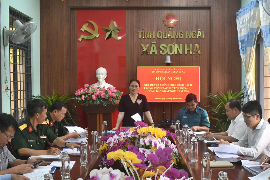 Trong 2 ngày 16,17/9 vừa qua, Hội đồng Nghĩa vụ Quân sự xã Sơn Hạ tổ chức xét duyệt chính trị, đạo đức, chính sách cấp xã chuẩn bị tuyển chọn, gọi công dân nhập ngũ năm 2026. Đồng chí Võ Thị Xuân Liễu – Phó Bí thư Đảng ủy, Chủ tịch UBND xã, Chủ tịch Hội đồng nghĩa vụ Quân sự xã chủ trì hội nghị. Đồng chủ trì có đồng chí Lê Tấn Tình – Chỉ huy trưởng Ban Chỉ huy Quân sự xã.
